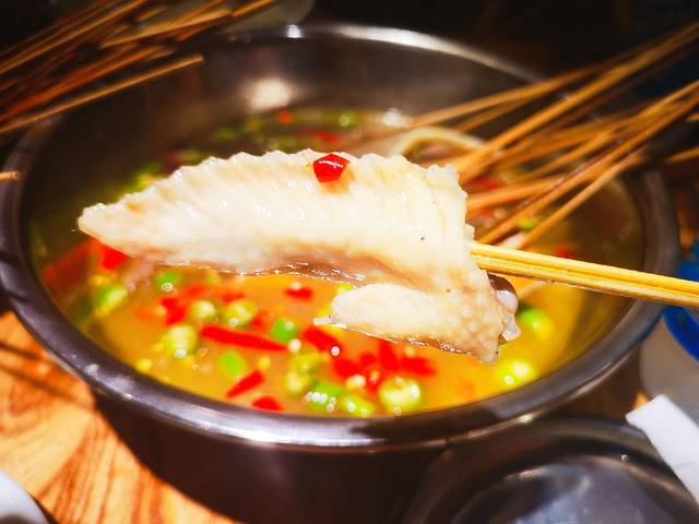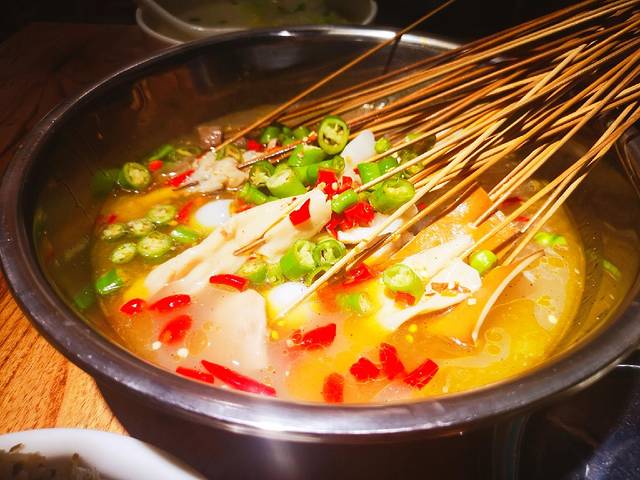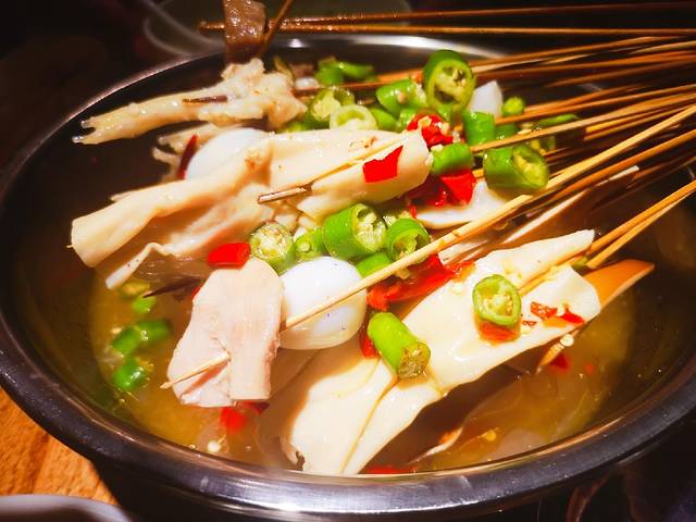 刚开始吃比较清淡,后来越吃越麻,大师兄比较喜欢。上面的青辣椒红辣椒看起来很漂亮。菜品在里面浸泡,看似简单,实则不然。
