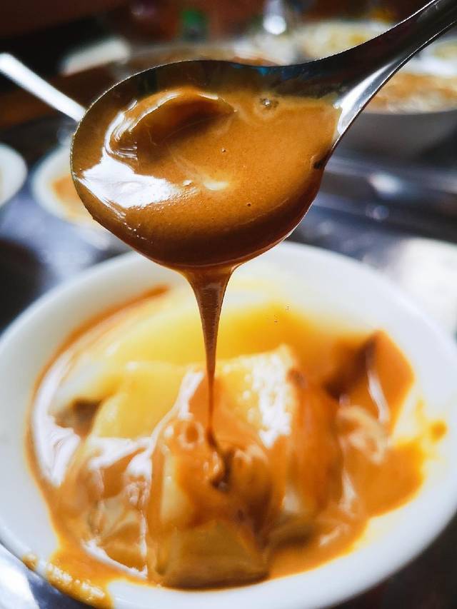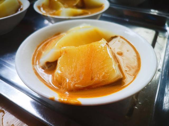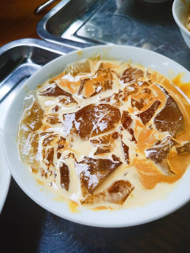 特点是翻沙红糖,粘稠,有颗粒感,口感不错,凉糕纯手工。碱的味道稍微重了点。