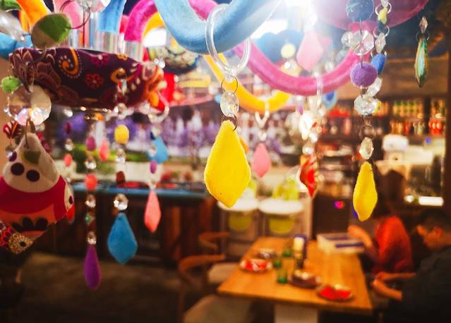 走进餐厅装修风格非常有情调,彩色的吊灯,佛陀的壁画,原木桌椅,层次丰富的门套窗套,的确是个性鲜明,稳定坚固,厚重自然。