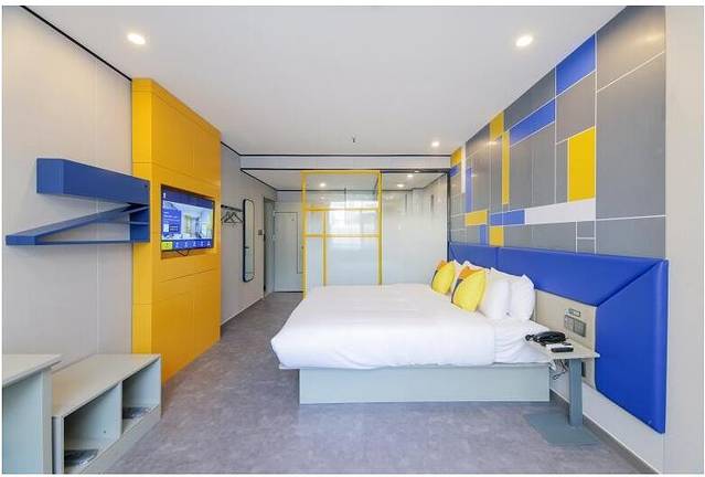 7天酒店3.0在形象上运用“商务蓝、活力橙、明亮黄”三种颜色的碰撞穿插来表达品牌年轻时尚的态度,不仅从视觉上一眼抓住了年轻心态消费者的心,更以高级的美学思辨带来合理的空间规划,完成有态度的颜值提升。
