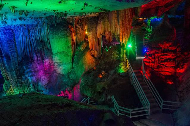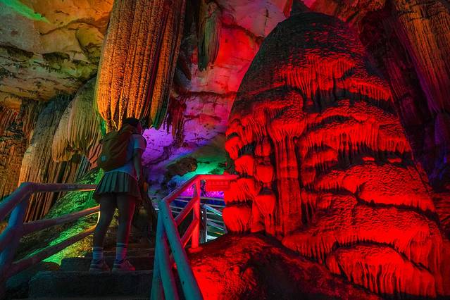 在溶洞深处,有一个灵宵宝殿,又叫九重天,传说是玉皇大帝居住的地方,是整个溶洞最精彩、最壮观的部分,有百仙宫、瑶池室、微景长城,还有万年神龟、无头天鹅、痴情蛤蟆、一柱擎天、倒石生花……