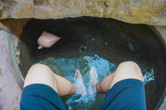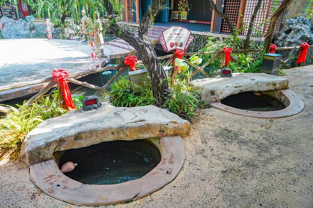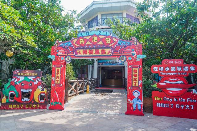 我们去泡温泉的时候人不多,刚进入温泉区,就看到了中国区辣椒温泉这个拱门牌子,然后发现了一个放了辣椒包的温泉池,工作人员说这个池水的温度有44度,加上辣椒包的加持,脚放进去有种泡麻辣火锅的感觉,把一身的寒气都祛除掉,有助于通经活络,排毒养颜,开胃止吐。