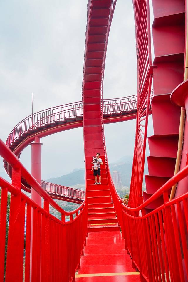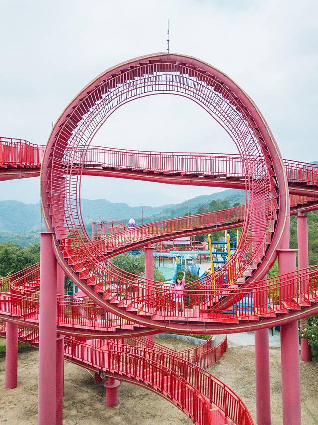 黑森林乐园最有名的就是“漫步过山车”了。这个过山车就有意思了,全程步行,150米的高度,360度旋转,走一圈还是有点累的,但是拍照太美了,仿佛漫步云端,浪漫又有趣!这些红色的过山车线条,在蓝色的天空下,划出一条条漂亮的弧线。
