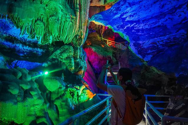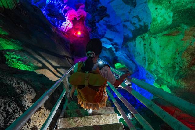 进入洞内,一股凉意袭来,在外面被日晒的焦灼感一下就没有了。再往下看,深不见底,仿佛无底洞一般,五光十色,钟乳石千奇百怪,让人有点期待又有点害怕,好似去探险。