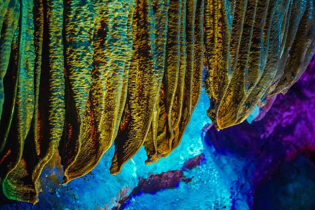 接着走下去,洞套洞,厅连厅,左右两边密布着形态各异的钟乳石,我们小心翼翼慢慢走着,一是因为阶梯比较陡峭,一是因为生怕一不留神错过了那些让人惊艳的钟乳石。
