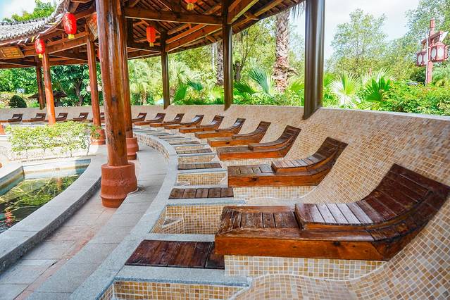 这里的泉水最大特色,就是含有微量元素氡,氡温泉对关节炎,皮肤病,痛风,高血压等疾病有一定疗效。温泉小镇里分为3个主题区,中国区,日本区和欧洲区,每个主题的环境都很不一样,可以体验到不同的温泉特色。