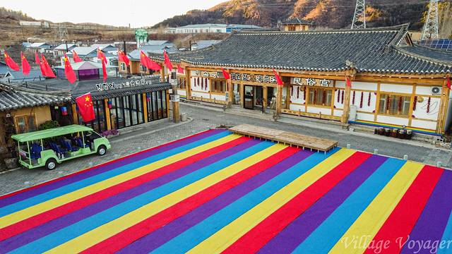 村子中央的金达莱广场上用彩色的条纹铺满地面,这里如今已经建成类似游客服务中心的地方,游客可以在这里换乘游览车,或是购买当地伴手礼回家。