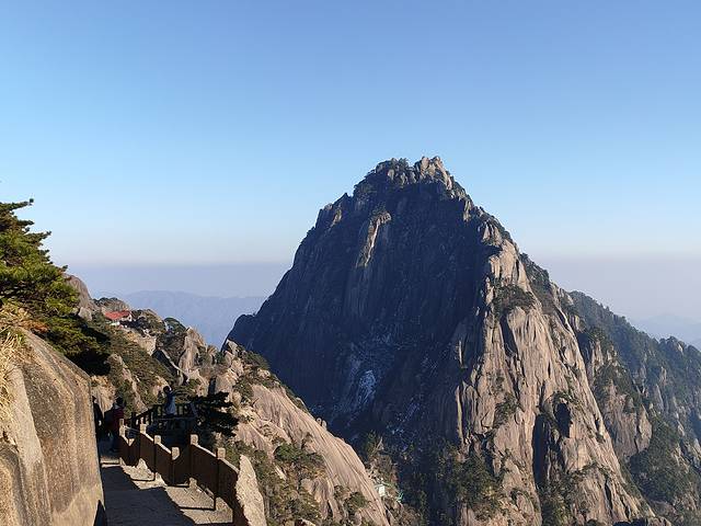 3. 光明顶上,有一处铁栅栏,进去之后才能比较好的观测到莲花峰和天都峰,在左边的石栏向下看,非常陡峭,看得我腿都软了。