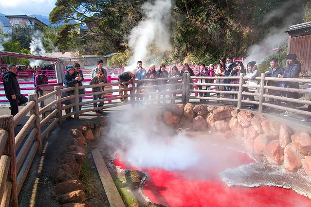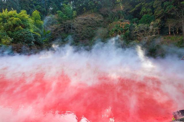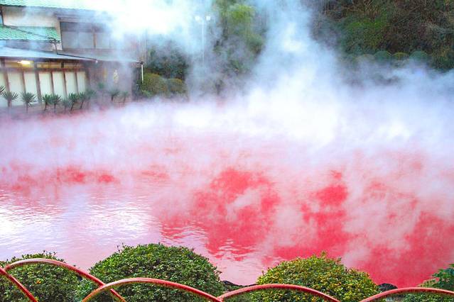 呈现红色的原因是在地下的高温与高压之下,富含了氧化铁与氧化镁的红热泥发生了自然的化学反应,从地层喷出后堆积在池子里,把温泉池子染上了一片红色!
