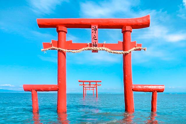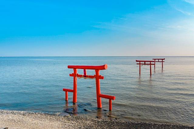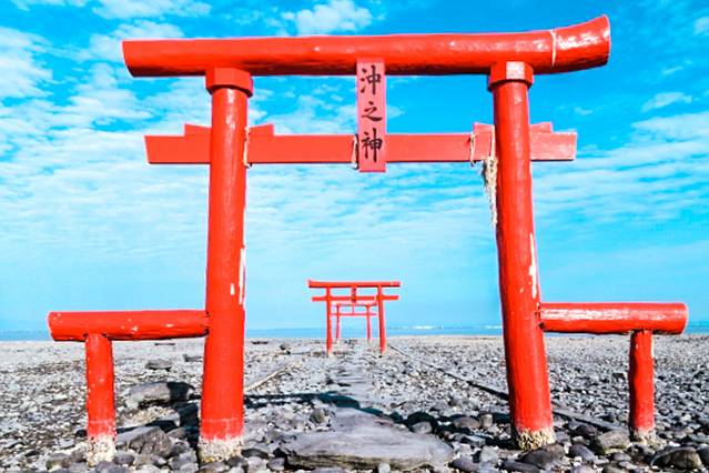 吃饱喝足,我们继续前往佐贺县的太良町。在这里,有神秘浪漫的大鱼神社海中鸟居!鸟居矗立的地方,也是当地潮汐差最大最明显的海岸。满潮时,海水会上升浸泡到鸟居的上部,退潮后鸟居又会从水底重回海面。潮退之后,游客甚至可以走到鸟居边自由拍照!