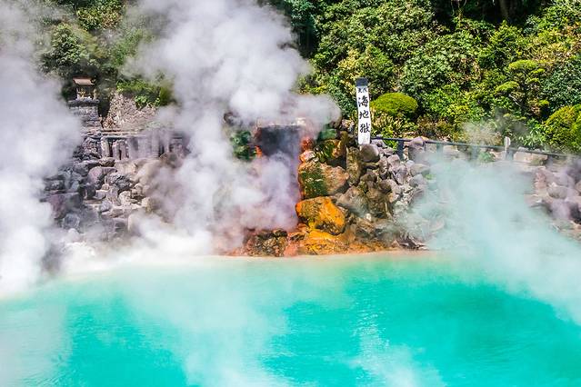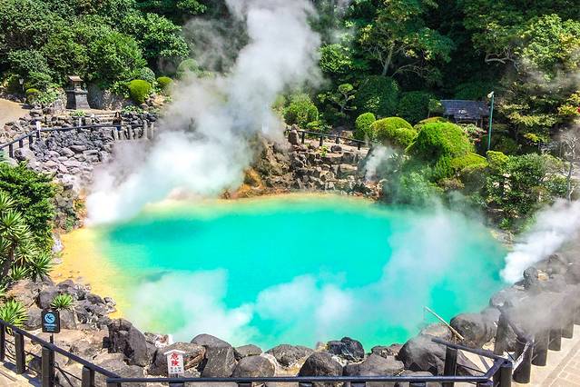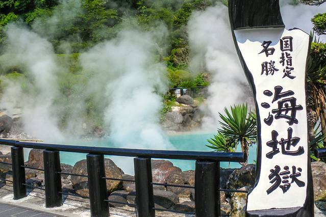 从别府坐车去期待已久的“别府地狱”。在车上便能看到这边四处“冒烟”,真像来到了地狱一样。首先去参观别府地狱中最大的海地狱,温泉的颜色是蓝绿色的,温泉水里富含硫酸铁成分,使得温泉呈蓝绿色。