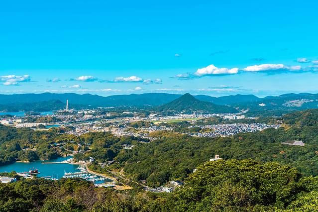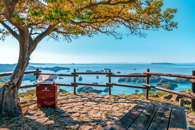 在标高191米的石岳山顶,可以360°全方位眺望九十九岛地区的自然美景。面前的海面上,漂浮这被绿树覆盖的岛屿,天蓝水清岛绿,犹如幻画出的梦见。空气中漂浮着大海与大山的清新味道,相当舒适。不少游客都在这边举起手机、相机,大拍特拍。