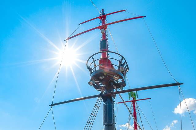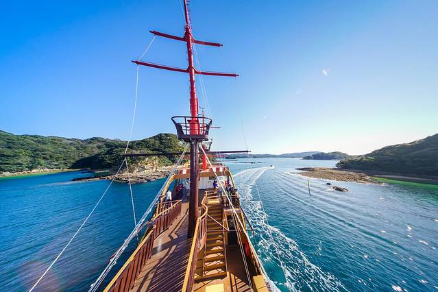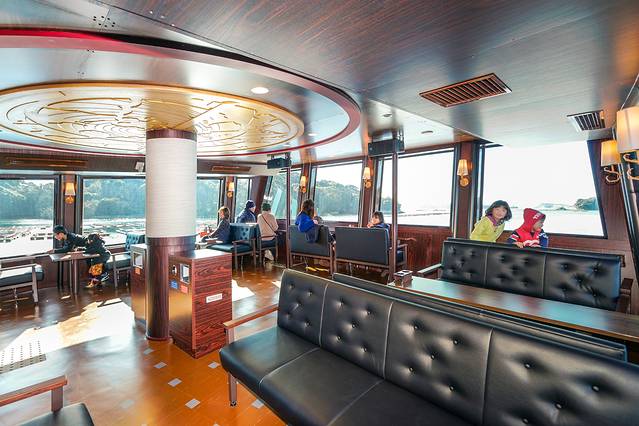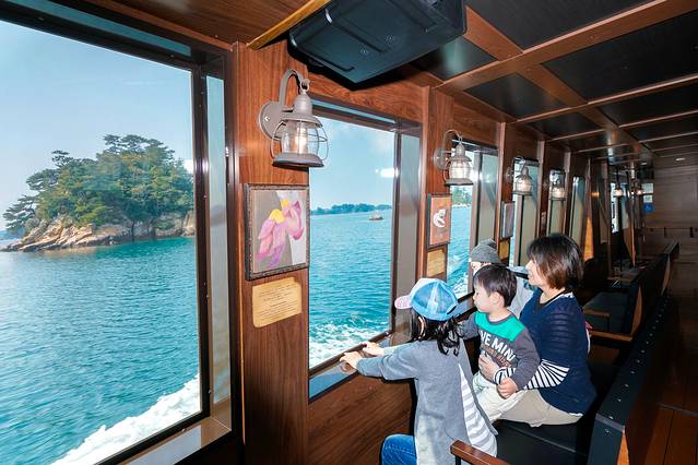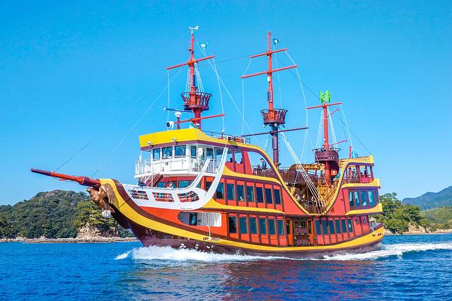 这艘主题游览船是日本最早的电力推动船,对自然环境非常友好。一层的大厅内有视野超好的大玻璃窗可尽享海上美景 。在二层,你甚至可以亲手握着舵盘,迎着风浪,将自己幻想成海贼船长!