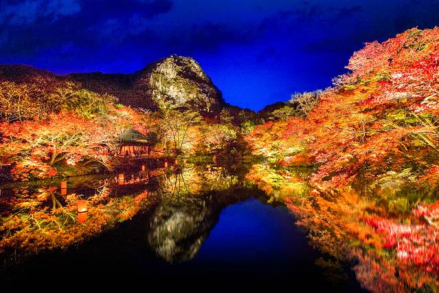 御船山乐园位于标高210米的御船山的西南脚下。在春天,这里能欣赏到两千棵樱花树,五万株杜鹃花绽放的盛景,宛如一幅山水画卷!到了夏季,公园会与活跃于世界各地的“team Lab”联合推出的数码艺术节,大家能够在此边看风景边赏超帅的光影艺术。到了秋季,池塘周边浸染的红叶景观,美艳绝伦!