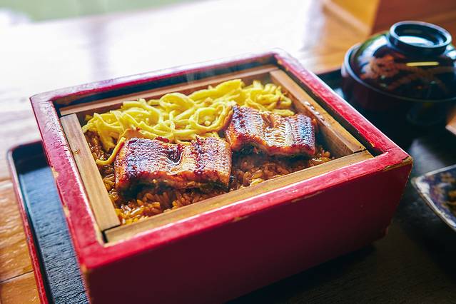 午餐一定要品尝下柳川最著名的笼蒸鳗鱼。拌有酱汁的米饭上铺上日式烤鳗鱼和鸡蛋丝,再放入蒸笼蒸煮一番,颗颗米饭都充分吸收了鳗鱼的浓郁鲜香。一口米饭一口鳗鱼,滋味纯厚幽远,原来幸福也可以如此的纯粹简单!