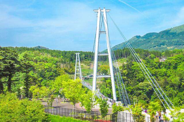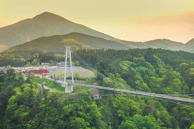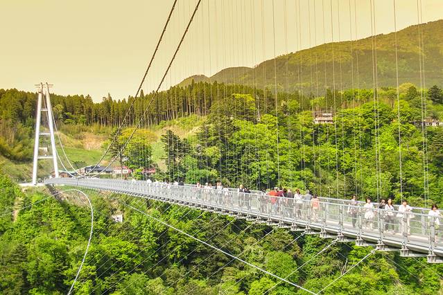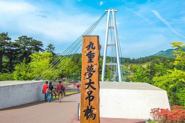 被誉为是天空步道的九重“梦”大吊桥是日本第一高的步行吊桥。于2006年10月30日开通,全长390米,高173米,宽1.5米。桥上有360°的大全景视角,可以欣赏到震动之瀑的雄雌双瀑。震动之瀑也是“日本百选名瀑”之一。