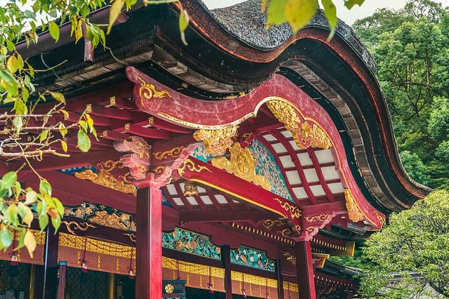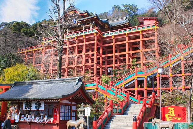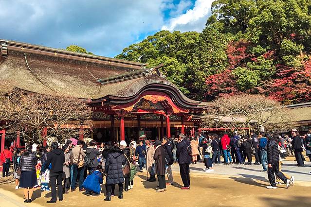 饱餐之后,我们前往太宰府天满宫!从太宰府车站出来便是太宰府天满宫的参道,一路上有众多饮食店与物产店,相当热闹。这里有美丽的朱红色本殿建筑,周围还有神苑、宝物殿等等。