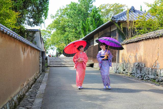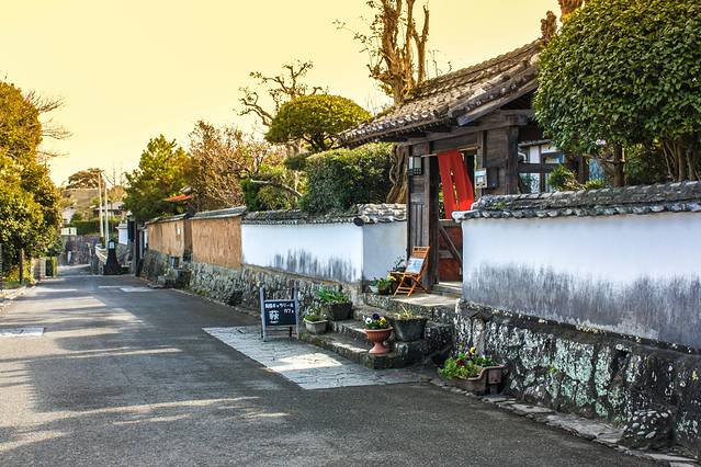 杵筑城下町有九州小京都的美称。这里是充满江户风情的街道,白墙黑瓦,江户时代感的建筑在这条街上随处可见。也有不少小姐姐在这边穿上和服散步。除了可欣赏古建筑,这里还是条适合边走边吃的小吃街。
