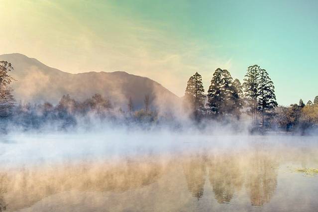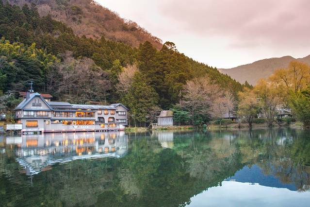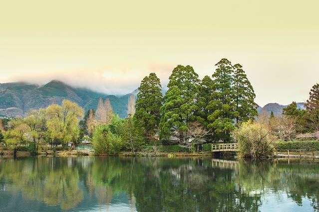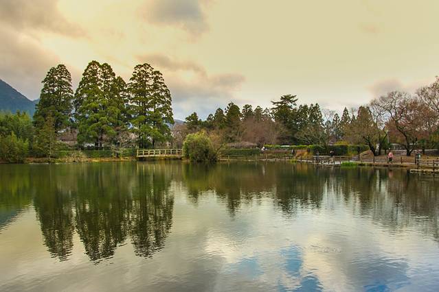 在彩色玻璃花窗博物馆附近就是由布院的代表景点之一的金鳞湖。这座湖是由明治初期的儒学者毛利空桑命名。据说这个湖水里混有温泉水,因此一年间水温都会比较高。在冬日的清晨,或是室外温度较低时,湖面上便会升腾起轻薄的水雾,形成梦幻的景色。