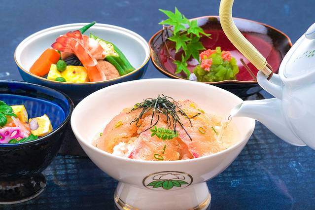 我们午餐就在这边品尝了“鲷鱼茶渍饭”。新鲜的鲷鱼生切成片,蘸酱油覆于米饭之上撒少许白芝麻再摆上海苔丝。备好之后,倒入茶汤。鲷鱼茶渍饭,饭要热,茶要滚烫,冲泡时,要由碗边倒入茶汤。鲷鱼鲜美,汤汁淡香,很是下饭,轻轻松松就可以干饭一碗!