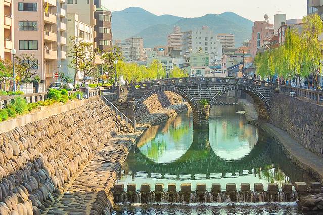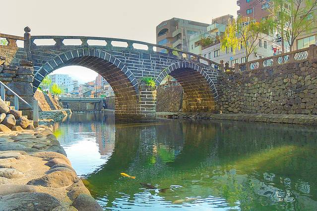 这座眼镜桥建成于1634年,是日本最早的双连式石拱桥。据说这座桥是由一位名为默子如定的中国僧人所造。