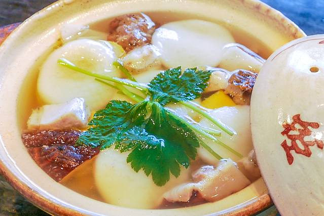 岛原的杂煮有点像国内的砂锅。锅内一般会有山药、牛蒡、莲藕、白菜、香菇、鸡肉、鱼糕、切片的玉子烧、春菊、年糕等十多种食材,鲜美的食材熬煮出的汤汁味道协调,滋味鲜美。尤其天冷的时候,更是驱寒暖胃。