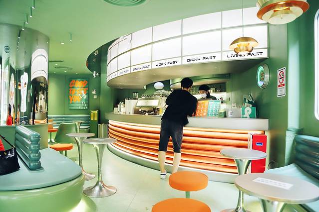 这家急急脚算是广州都网红咖啡厅,主打花式冰饮,店子装修是真的不错,橙绿色主调,图案和LOGO也很80年代玩具的感觉~有点时尚、有点未来,却又有点复古……难以一言以蔽之。