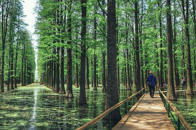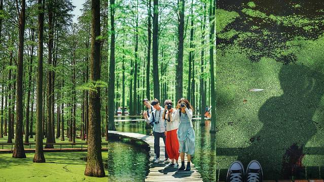 抹茶糊其实并不算大,典型的水杉湿地生态,想来这里到了秋天,也将是一片金黄色,色彩应该不亚于春夏,但因为缺少了来自大地的绿色浮萍的衬托,似乎又少了一点来自“人间”的色彩。