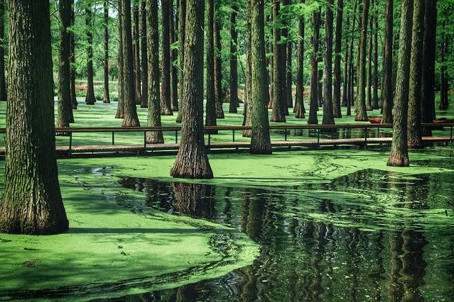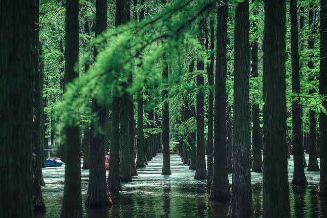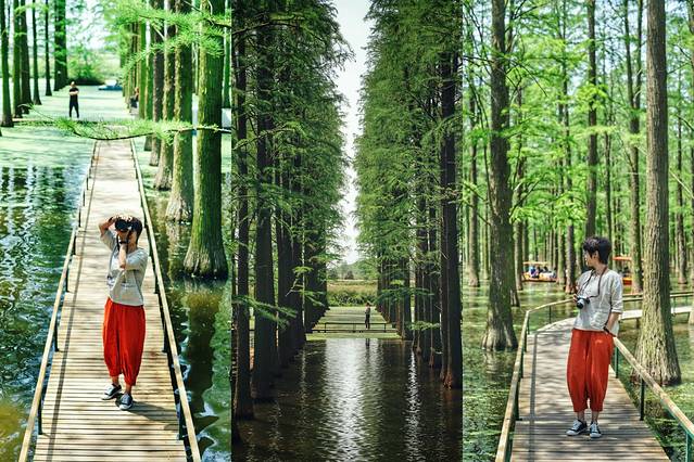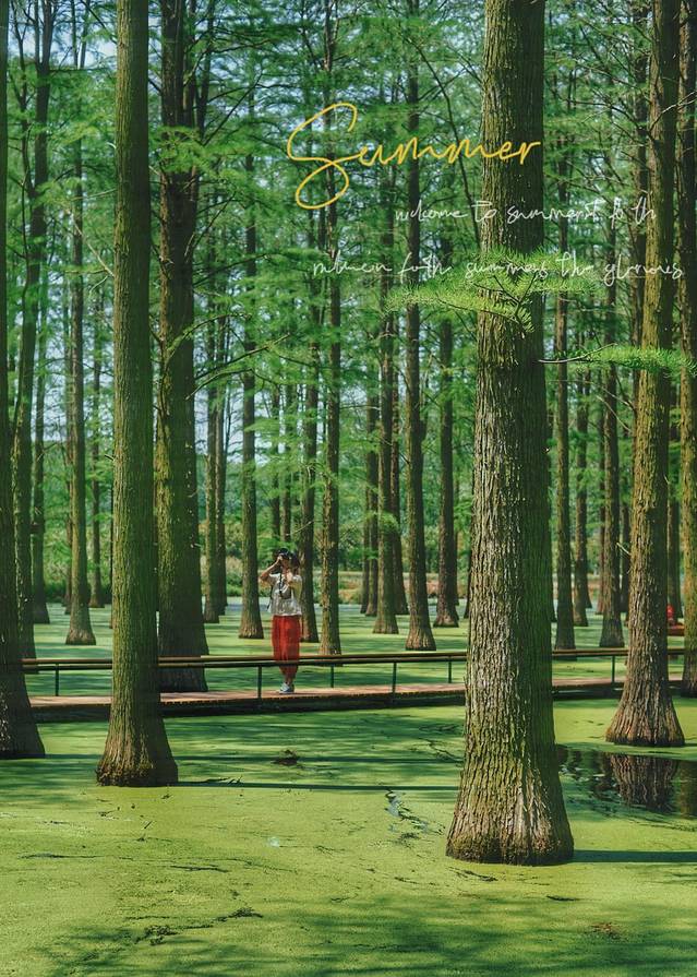 高大的水杉直耸入云霄,阳光从缝隙倾斜而下洒在浮萍之上,斑驳阑珊,幽深静谧,想不喜欢都好难~