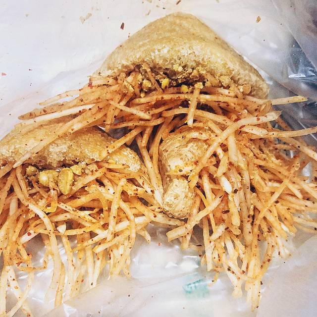 脆皮豆腐干:用油炸得香脆的三角形豆制皮,包着凉拌的萝卜丝馅儿,蘸上酸酸甜甜的糖醋汁,OK!