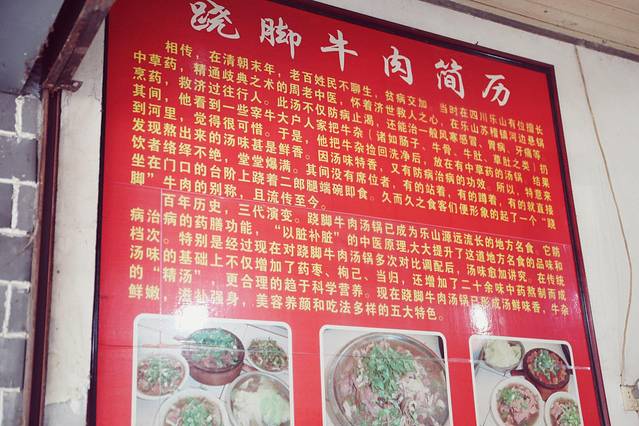 至于很多人问为什么叫“跷脚牛肉”,我也专门问了下老人们。官方回复:“相传,在30年代初,老百姓民不聊生,贫病交加。当时在四川乐山有位擅长中草药,精通歧典之术的罗老中医,怀着济世救人之心,在乐山苏稽镇河边悬锅烹药,救济过往行人。此汤不仅防病止渴,还能治一般风寒感冒、胃病、牙痛等……”(如图所示)