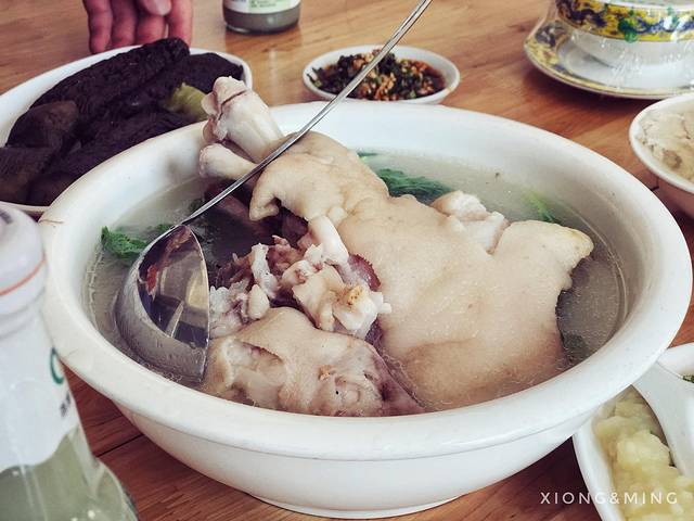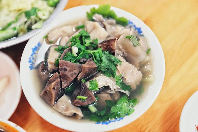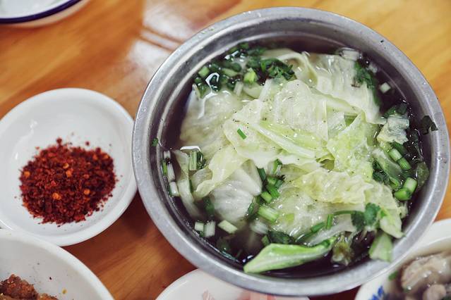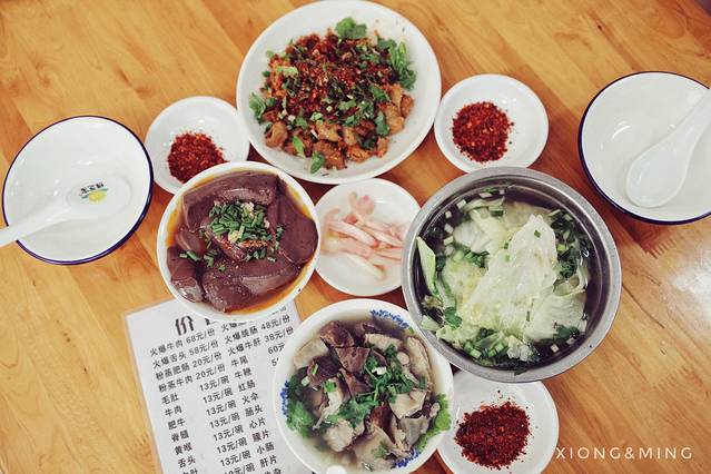 还是要给外省朋友通俗易懂的介绍下:跷脚牛肉主要就是把牛肉身上各部位东西全都放到一起煮,包括牛肉、牛舌、牛肝、牛耳、牛肺、牛心、牛肚、牛肠、牛百叶、牛筋、牛腩、牛脑、牛骨、牛髓、牛鞭、牛血等……经典在于它的汤和碟:正宗跷脚牛肉的汤是灰褐色的,原汤原味;味碟就是干辣椒面+盐+味精+香菜/葱,容易被外地人忽略的菜品是脆白菜。