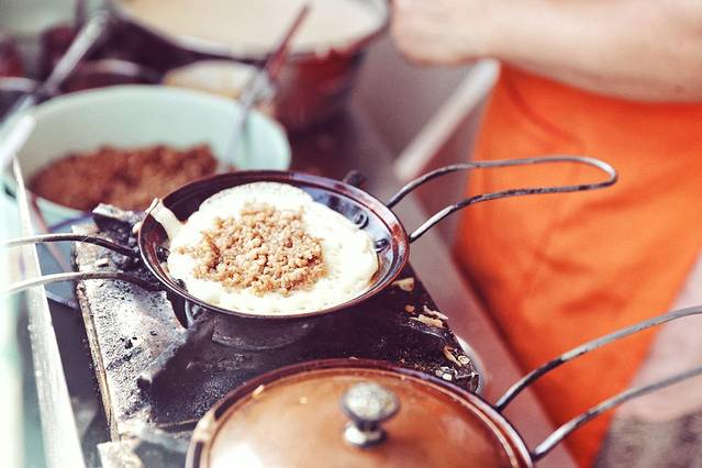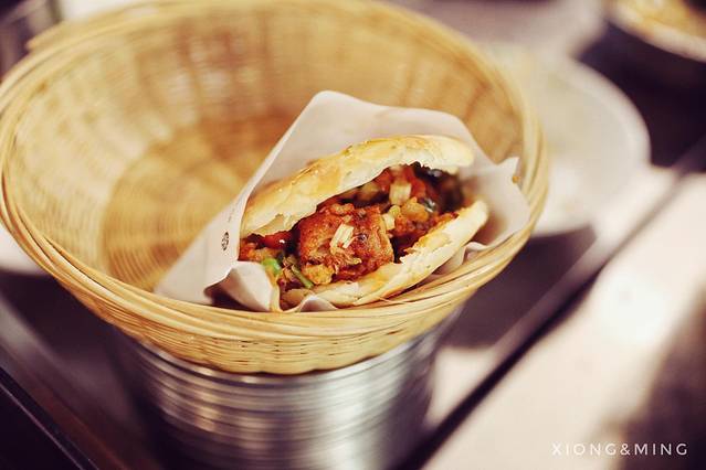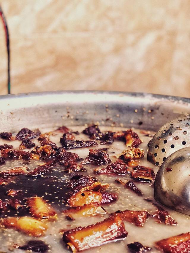 豆腐脑的绝配,那就是咔饼了。所谓咔饼,就是面饼里面+馅儿,精华就在于这个馅儿。老板会问你:咔肥肠还是牛肉,你可以选择:双拼!肥肠、牛肉又属于乐山另一道名小吃——蒸笼肉。它可以成为独立的一道菜,它更是各种搭配的翘楚。不吃咔饼的,也可以选择在豆腐脑里面直接加蒸肉。
