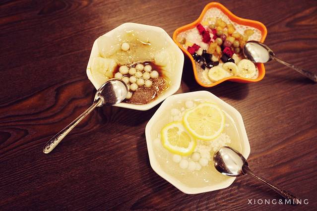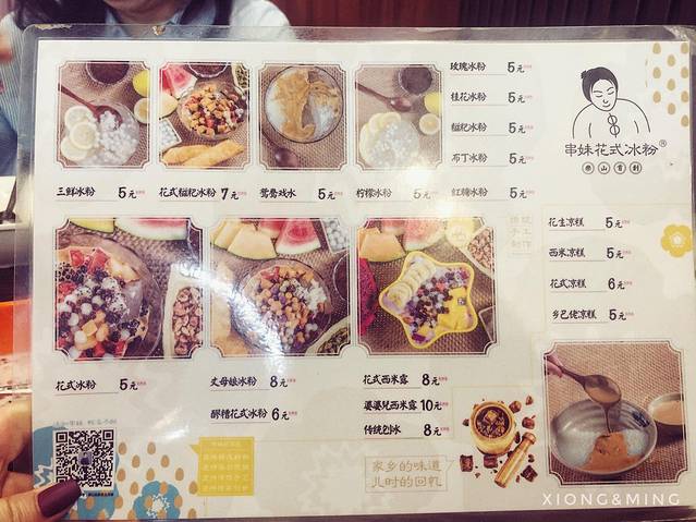 必点冰粉儿口味:三鲜冰粉(柠檬、醪糟、小汤圆、冰粉)、鸳鸯戏水(冰粉和凉糕混合,经典红糖味)、丈母娘冰粉(在冰粉里面加了各种水果、糍粑……)、婆婆西米露(在西米路里面加了各种水果、糍粑)……