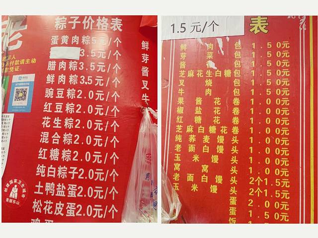 包子、馒头 、花卷、稀饭……花卷有粉红色的甜花卷、白色的咸花卷、焦糖色的红糖花卷;包子有牛肉包、叉烧包、鲜肉包、菜包、糖心包;馒头也分了白面馒头、玉米馒头、红糖馒头;就着白稀饭、绿豆稀饭、蔬菜稀饭……真是踏实又清新的早餐了,也是最平价的早餐了。除此之外还有乐山特色泡粑、叶儿粑,端午会出粽子,中秋会售糍粑,应景每个传统节日。万年不涨价,如上图。