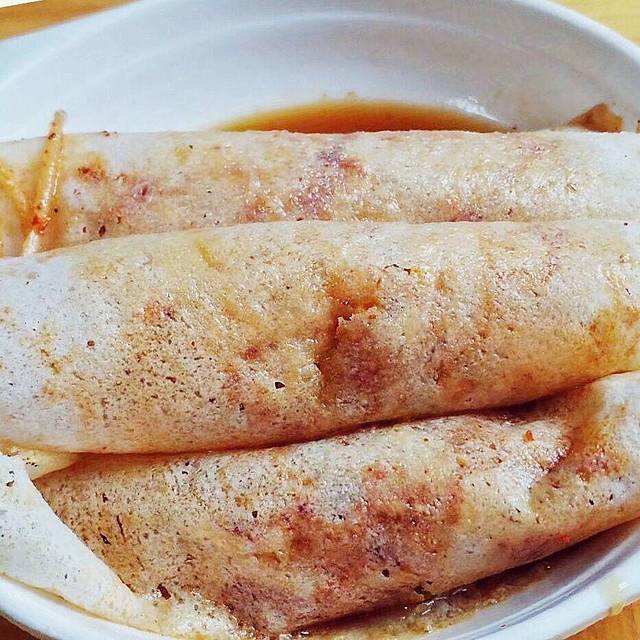 薄饼:一般在卖豆腐干、冷串串的摊位上都有。是用一张半个巴掌大的很薄几乎透明的饼,将拌好的萝卜丝+炒黄豆米+白糖+芝麻面等作料,全部包裹好,配上调好的甜醋。