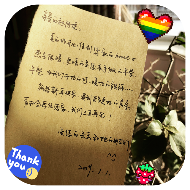 跟阿姨合了影(没洗脸的我),加了微信,在楼上收拾行李时发现一张上一家租客留下的纸条,赵阿姨果然是一个温暖的人勒。于是,我也忍不住给阿姨留下了一张纸条。后来阿姨还拍照发给我,说她认识我们也特别温暖。