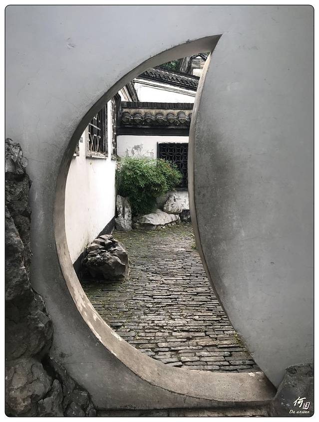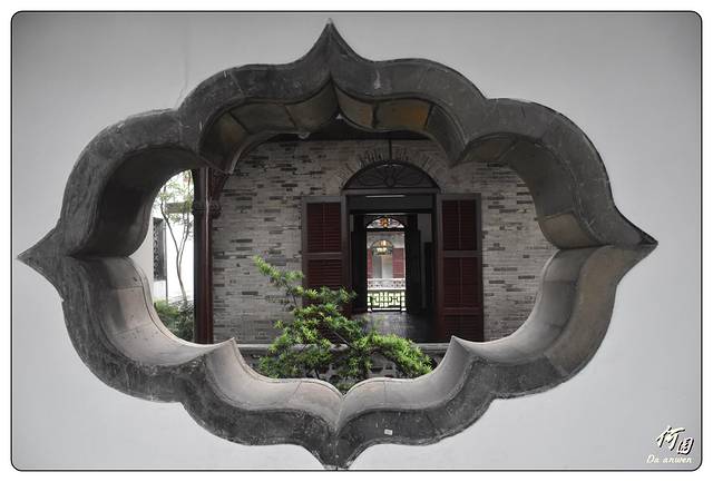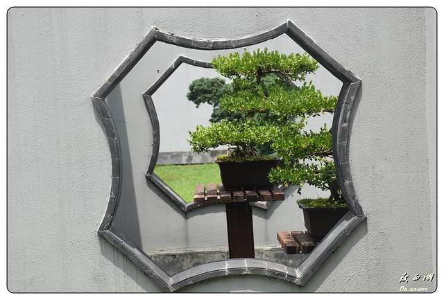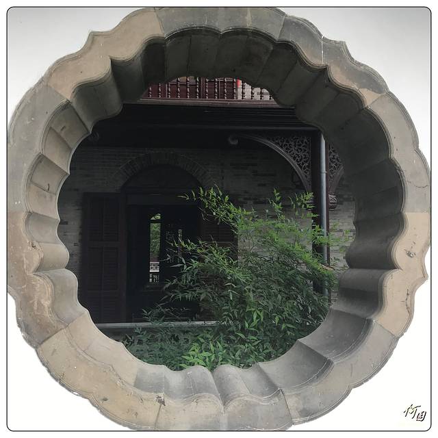 半封闭的景观墙上,有很多形态各异的窗口。透过这些窗口拍盆景也非常有趣。