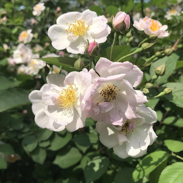 美丽的蔷薇花在微风中和姐妹们一起翩翩起舞,用一张张笑脸展示着别样的美丽。