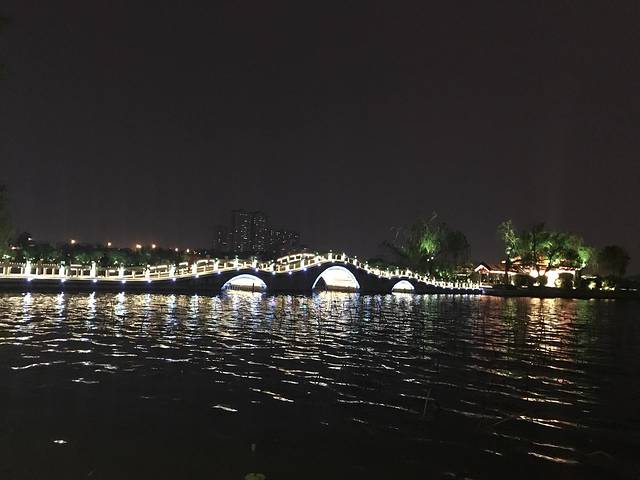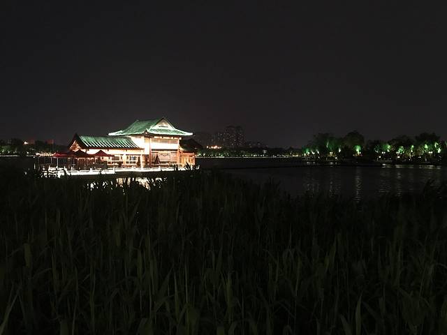 湖边凉风习习,有休闲散步的,也有夜游慢跑的。