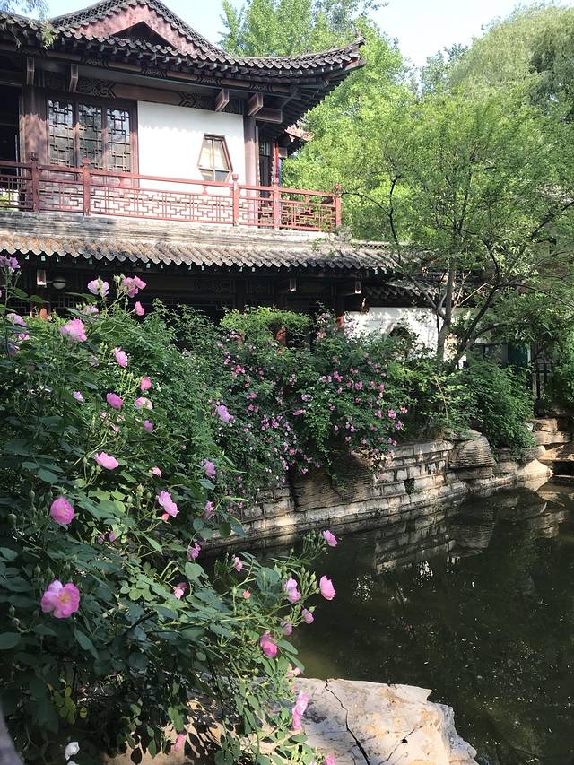 湖边的蔷薇花开得正好。