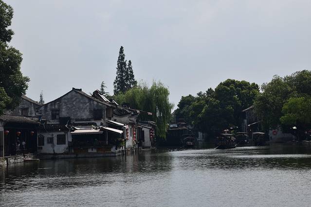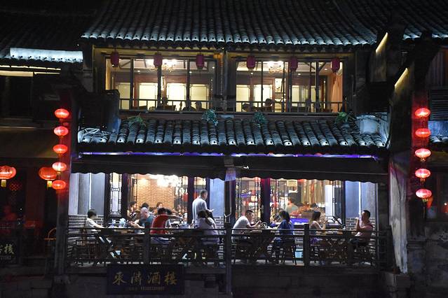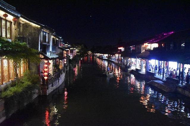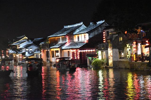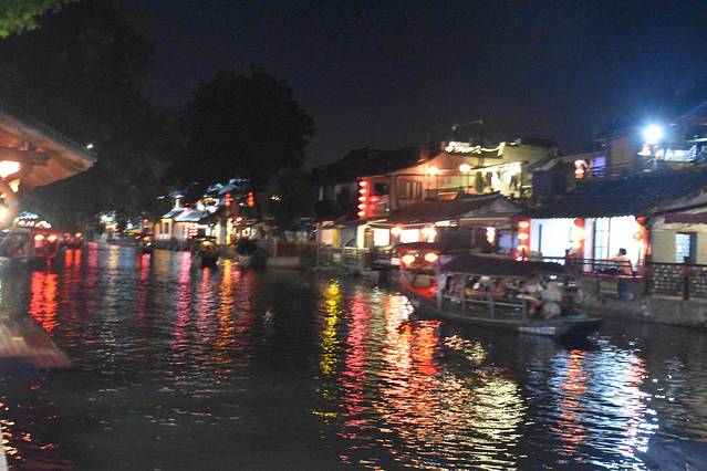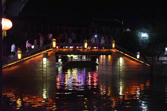 夜晚的西塘游客众多,都沉醉在五彩斑斓中。
