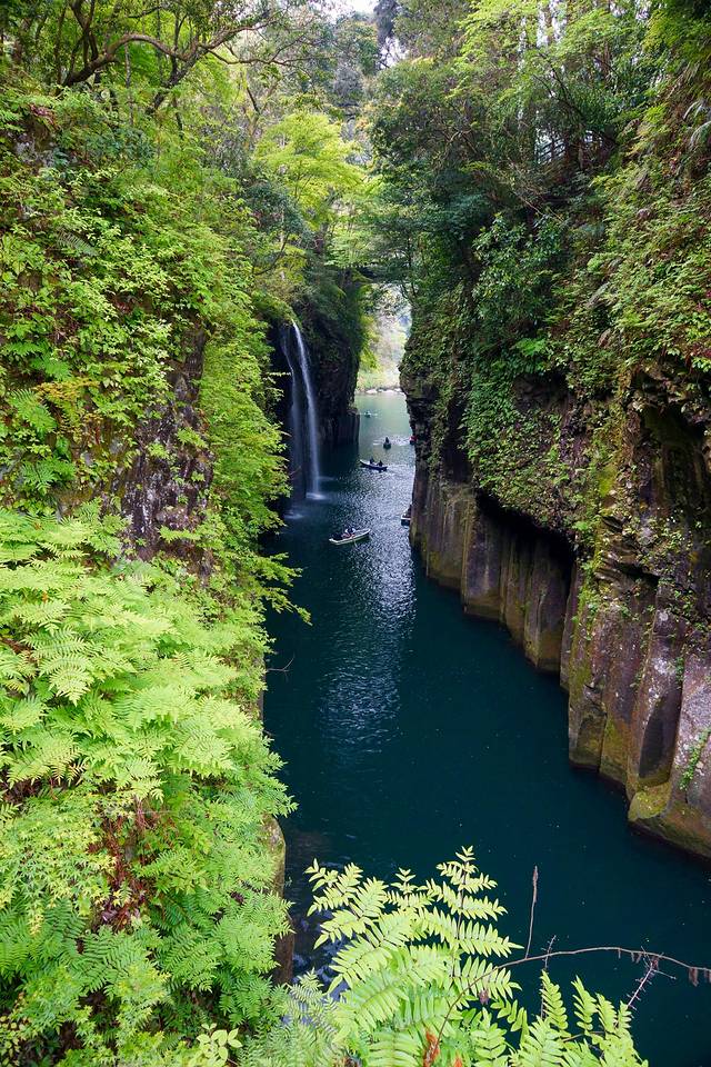 第二站,我们来到了高千穂峡。高千穗峡又被叫做五濑川峡谷,这里的断崖最高能高达100米,绵延7公里长,看起来十分险峻。也正因为断崖的落差比很大,所以这里也是一个极佳的观景地。看到瀑布倾泻而下时,脑子里就只会剩下一句话“飞流直下三千尺,疑是银河落九天”。