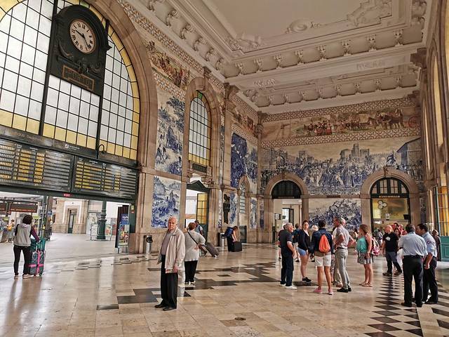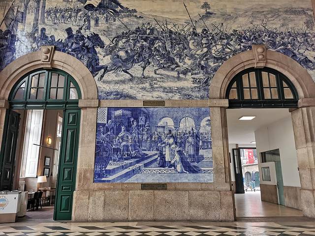 或许是崇尚海洋之色,大部分瓷砖画都是蓝白双色。启用于1916年的波尔图圣·本笃火车站,就因墙面上描绘葡萄牙历史的蓝白瓷砖画而著名。我们并没有在圣·本笃火车站乘车,但也不肯错过这个美丽的火车站,清晨特意步行前往参观,一进门果然就被墙面上巨大的瓷砖画给吸引了,乍眼一看,真有些像小时候用蓝色圆珠笔在白纸上画的画。