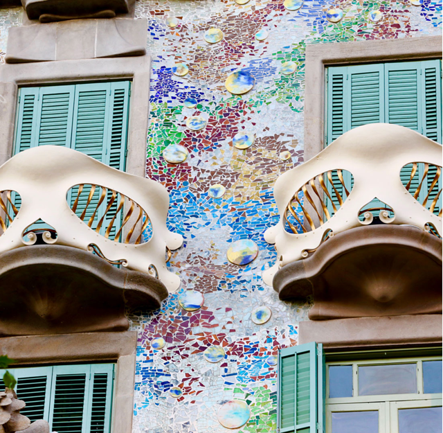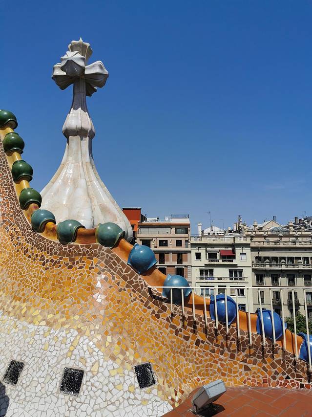在巴塞罗那,天马行空这个词是专属于高迪的。从远处看,巴特罗之家外观整体披上了一层巨大花布,墙面上的彩色玻璃和陶瓷碎片在太阳光下波光粼粼。弧形阳台像是某种动物的骨骼,又像是舞会上的假面。屋顶如同剑龙危险的背脊,背脊上瓷片拼接的马赛克像它长出了五彩斑斓的鳞片。
