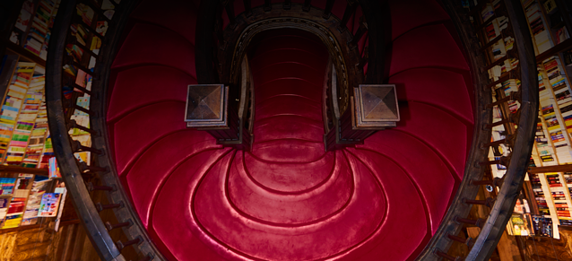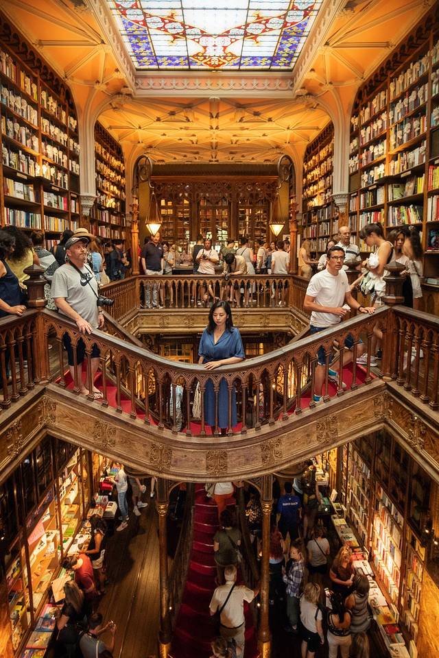 如果你热爱建筑,那么这个书店对你来说还有更多细节可以挖掘。莱罗书店是原址夏多龙书店的翻新,设计者是一位热爱文学的工程师Xavier Esteves。是的,官方资料表明,Xavier Esteves并非建筑师,而是工程师,可这并不妨碍他成功的设计出世界上最独特最美丽的书店之一。新哥特式的雕花立面上,左右两侧各有一位女神像,代表了科学和艺术。内部装潢精致华丽,“书架上摆满了书,一直到天花板上”。书店正中深红色螺旋楼梯通向二楼,站在二楼远处看去,它像一座架在半空的小型桥梁,有人说这正是《哈利·波特》中移动楼梯的灵感来源。