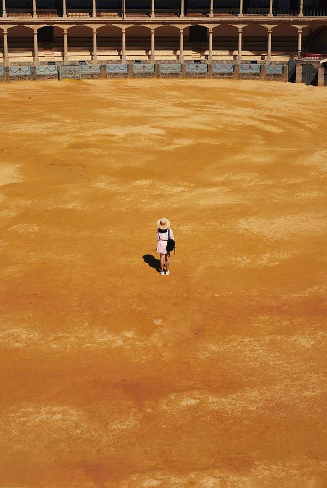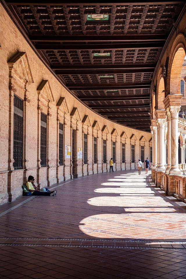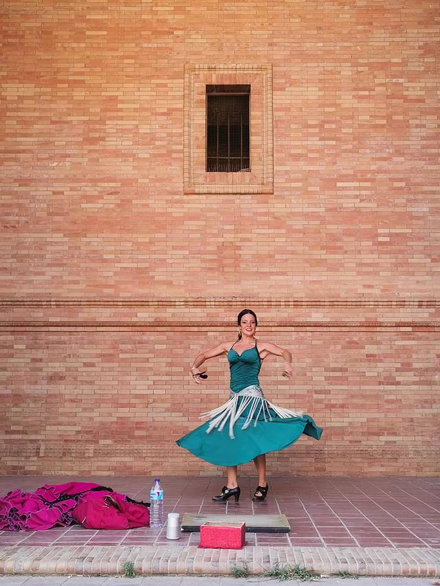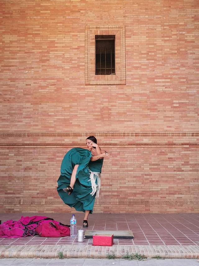 西班牙各个城市都有“西班牙广场”,但塞维利亚的西班牙广场公认是全西班牙最美的广场,它也是《星球大战》的取景地。我们在正午到达,烈日垂直高悬,直径170米的巨大圆形广场赤裸的暴露在日光中,广场地面没有一处供人歇凉的阴影。我本无意游览,躲在广场二楼阴凉处,但却被底层传来的奇怪节奏声吸引,顺着声源找了去。原来是一位身着绿群的卖艺女子在墙角跳起了弗拉门戈。橙红的墙面,绿色的缎带长裙裙摆飞舞,舞者的鞋子敲出激昂的声响,那画面简直太动人了,太西班牙了,兴奋的我不知不觉竟在烈日下驻足观看了二十多分钟。