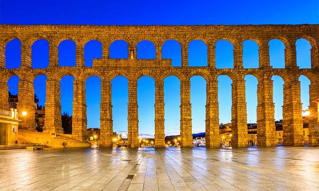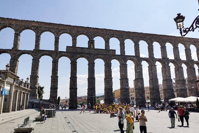 这个引水渠是两千多年前罗马人在西班牙留下的最宏伟的工程之一,它以28米的高度出现在塞戈维亚小镇最中心的位置,来到这里的游客没有人不为它感到震惊。巨大的石块一个叠一个,构筑起167个拱门,石块与石块之间没有使用类似水泥与灰浆之类的任何黏结剂。这一点我至今仍表示怀疑,没有黏结剂那不就像搭积木般摇摇欲坠吗?或许有其它无需使用黏结剂的固定技巧?这就需要懂古罗马建筑的专家来告诉我了。