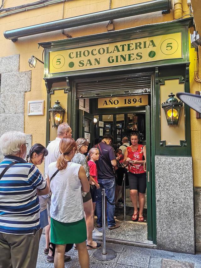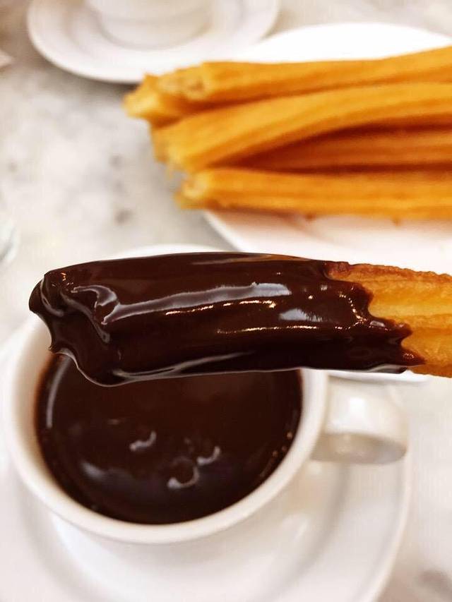 西班牙的油条,其实跟咱们国内的油条很相似,我怀疑是大航海时代中国传入西班牙的。都是面粉做成条状用油炸,只是西班牙人用裱花筒挤面条,这样出来的油条细细的带着花边。最不同的一点是,西班牙油条是裹着巧克力酱入口的,通常会再配上一杯香浓的咖啡。