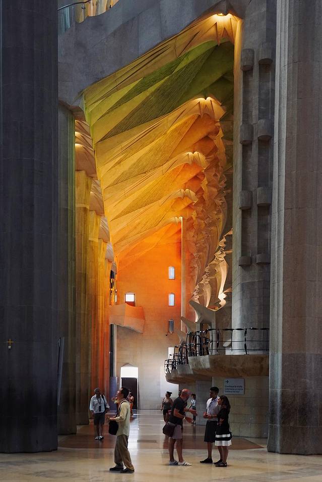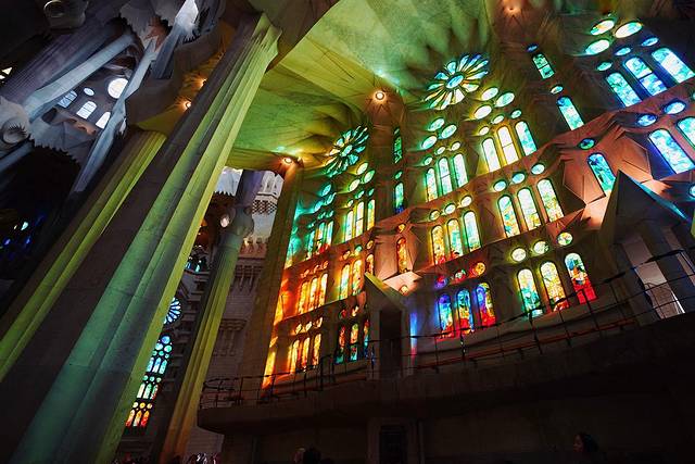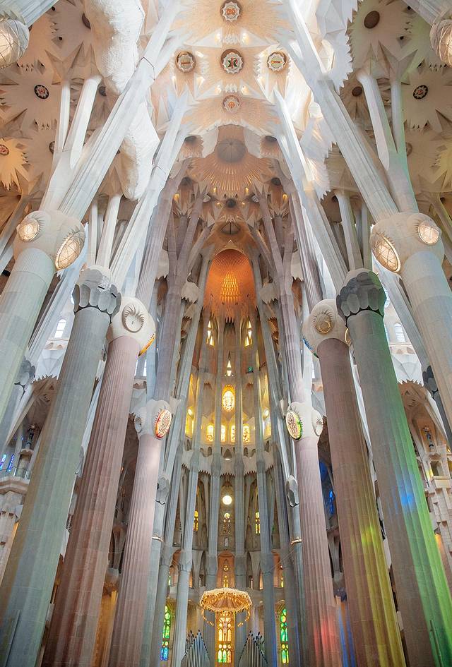 在我看来,教堂内部像是一片森林,一根根高耸的立柱如树枝向上蔓延,在穹顶绽放出建筑艺术的花朵。在这片森林里,光影是绝对的主角,室外光线透过墙上的彩绘花窗,在内部空间游离变换,圣家堂内呈现一片色彩斑斓。这是梦幻森林还是美妙天堂?抑或奇异太空?伟大的建筑师留给人们无限遐想的空间。